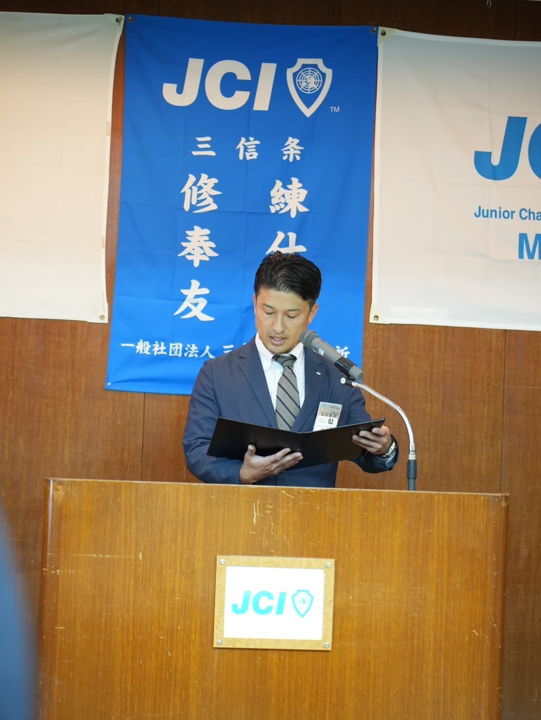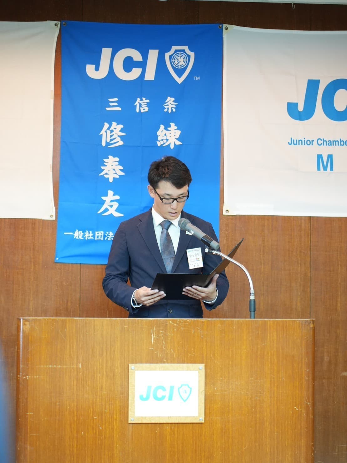 10月例会は入口委員長率いる総務渉外委員会の設営の元、開会となりました。セレモニーはJCIクリードを岸本和也君、JCIミッション・JCIビジョンを粂田真吾君、JC宣言文朗読並びに綱領唱和を中山基軌君が行いました。
