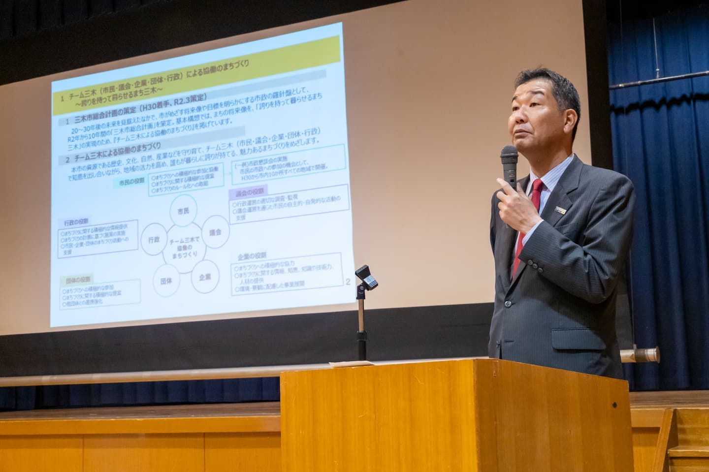 仲田三木市長、田中淳様(株式会社ネスタリゾート神戸 代表取締役)、岸田光二様(サムティ株式会社 硬式野球部 GM)にご登壇いただき、「行政によるまちづくりの取り組み」「チーム三木による協働のまちづくり」「思い描く三木の未来」などをテーマにご講演いただきました。