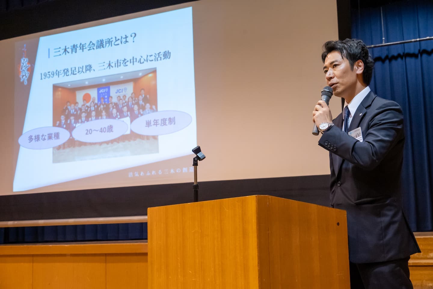 続いて、三木青年会議所より、まちづくり団体として地域に根ざした活動についてご紹介いたしました。今回は、私たちが地域団体としてまちづくりに取り組む意義や想いを、小山委員長がプレゼンテーションいたしました。