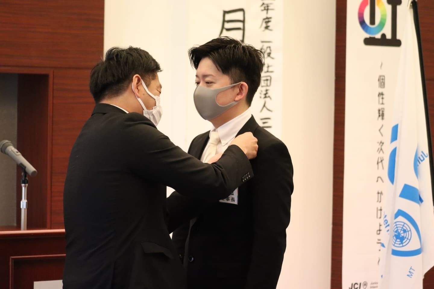 泉直前理事長から田中理事長へ理事長バッヂの引き継ぎ