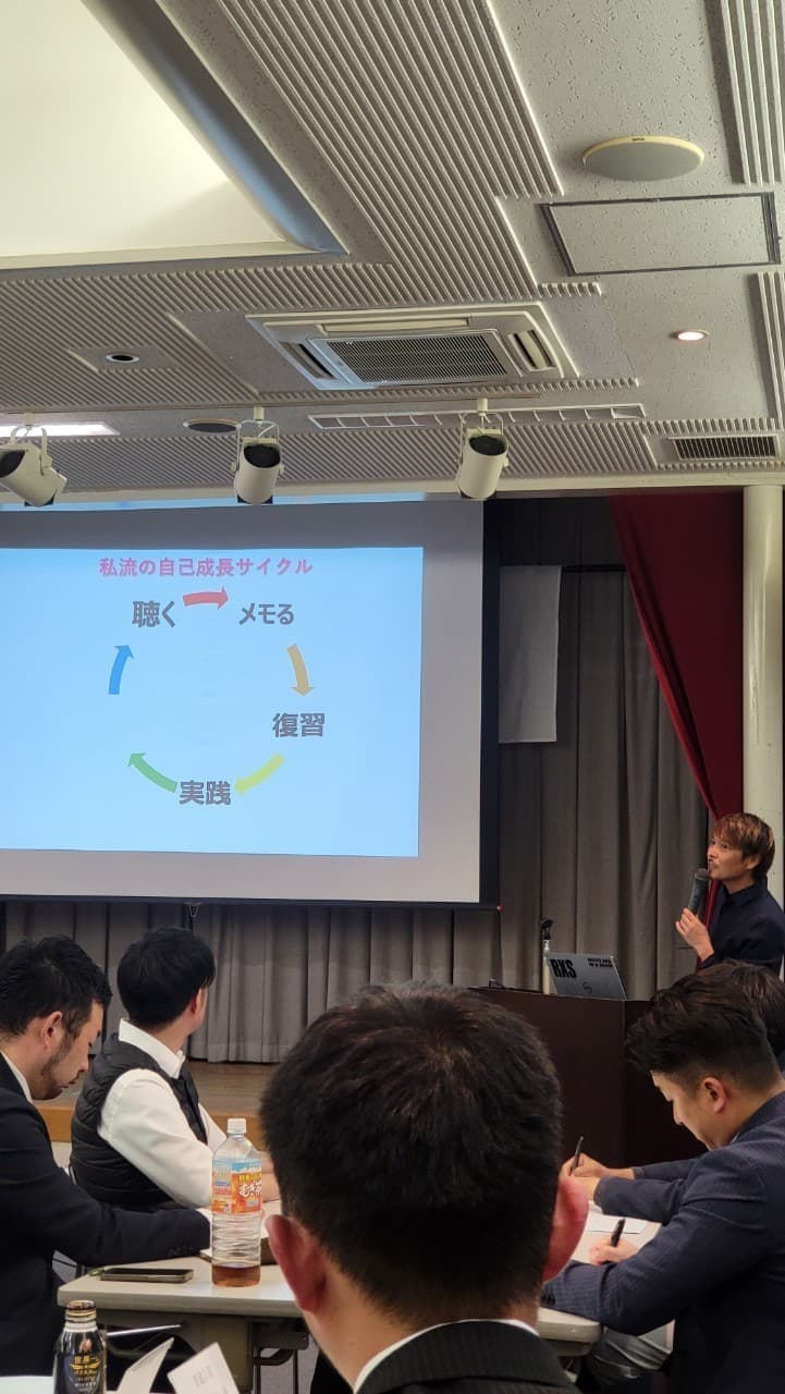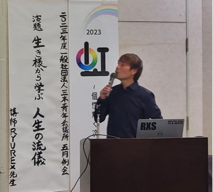 5月例会は宮脇委員長率いる拡大広報委員会の設営となっており、前半は現役会員のみでセレモニーや理事長挨拶、各種報告等が行われました。後半は約15名の一般参加者にお集まりいただき、MEGARYUのRYUREX氏を講師としてお招きして「生き様から学ぶ人生の流儀」というテーマでご講演いただきました。